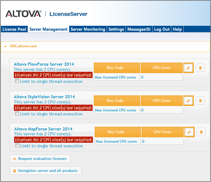 In the screenshot below, three Altova products have been registered with the Altova LicenseServer at DOC.altova.com. How to assign licenses is described in the next section, Assign Licenses to Registered Products.