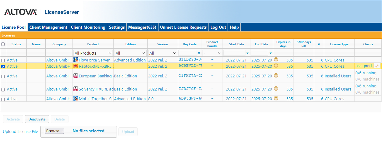 After you have obtained a license file for your Altova product (file extension .altova_licenses) from Altova, save this file to a suitable location and upload this file to Altova LicenseServer. Each license file can contain one or more licenses and depends on your purchase. When you upload a license file, all the licenses in it will be uploaded to the license pool of LicenseServer and can be assigned to an Altova product that has been registered with that LicenseServer. All the uploaded licenses, from one or more license files and for all Altova products, are collected in a license pool on the LicenseServer. The license pool is displayed in the License Pool tab of the LicenseServer Configuration page (screenshot below).